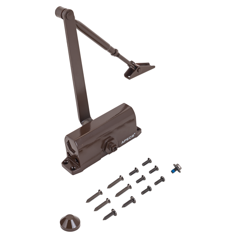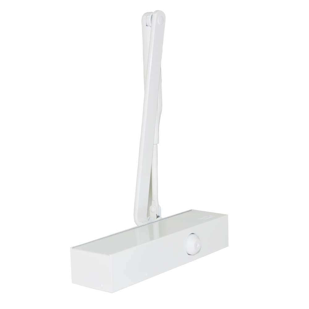 Доводчик с рычагом — наиболее распространенный механизм. Благодаря оптимальному соотношению цены, характеристик и долговечности ее используют для установки на входных и внутренних дверях в помещениях с большим потоком людей. Они предназначены для интенсивной эксплуатации и не выходят из строя при частом открывании и закрывании полотна.